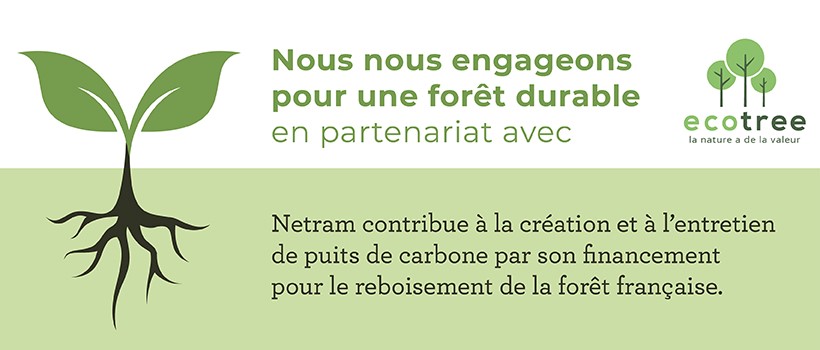 Etant particulièrement soucieux des sujets environnementaux, NETRAM s'engage pour une forêt durable en partenariat avec ECOTREE. Ensemble, nous contribuons ainsi à la création de puits de carbone et à leur entretien. Depuis maintenant presque un an, grâce à chacune de vos commandes, nous finançons le reboisement de la forêt française. Retrouvez toutes les informations sur les actions avec Ecotree via leur site internet : https://ecotree.green/